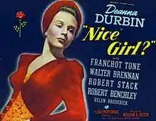 Nice Girl? is a 1941 American musical film directed by William A. Seiter, and starring Deanna Durbin, Franchot Tone, Walter Brennan, Robert Stack,[2][3] and Robert Benchley. Based on the play Nice Girl? by Phyllis Duganne, the film is about a young girl who finds herself attracted to one of her father's business partners who comes to town to give her father a scholarship for his dietary studies.[2][4]