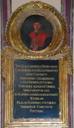 Copernicus was reportedly buried in Frombork Cathedral, where a 1580 epitaph stood until being defaced; it was replaced in 1735. For over two centuries, archaeologists searched the cathedral in vain for Copernicus' remains. Efforts to locate them in 1802, 1909, 1939 had come to nought. In 2004 a team led by Jerzy Gąssowski, head of an archaeology and anthropology institute in Pułtusk, began a new search, guided by the research of historian Jerzy Sikorski.[79][80] In August 2005, after scanning beneath the cathedral floor, they discovered what they believed to be Copernicus's remains.[81]