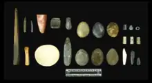 The first archaeological visit to San Nicolas was by Paul Schumacher for the Smithsonian Institution in 1875. His team uncovered numerous artifacts from surface sites, assumed to be from a later period of Nicoleño culture, as the island's climate is not well suited for preservation. Artifacts collected by these early visitors include grass matting and clothing fragments, bone knives and fishhooks, and soapstone fish and bird effigies.[11] Nicoleño culture was entirely dependent on the ocean for sustenance, as the island was home to only four types of land animals, none of which were valuable for food. The island is home to a large abundance of fish and sea mammals, as well as birds, which the Nicoleño were skilled at catching.