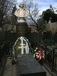 Gogol was mourned in the Saint Tatiana church at the Moscow University before his burial and then buried at the Danilov Monastery, close to his fellow Slavophile Aleksey Khomyakov. His grave was marked by a large stone (Golgotha), topped by a Russian Orthodox cross.[30] In 1931, Moscow authorities decided to demolish the monastery and had Gogol's remains transferred to the Novodevichy Cemetery.[31]