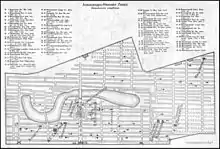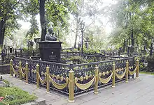 The cemetery was opened in 1863, to the east of the Cathedral of the Holy Trinity, the main church of the monastery.[1] It was the third cemetery in the complex, after the original Lazarevskoe Cemetery in the 1710s, and the Tikhvin Cemetery in 1823.[1] It was constructed on a space originally planned for a garden at the main entrance to the monastery, but that instead had become used for roads and palisades.[2] It was first called the Zasobornoye Cemetery (Russian: Засоборное), but became known as the Nikolskoe after the construction of the Church of St. Nicholas between 1868 and 1871 to the design of diocesan architect Grigory Karpov.[1][2] The church was funded by the wealthy merchant N. I. Rusanov, who established his family tomb on the ground floor.[3] The Spiritual Council noted that "the Lavra cemetery is not open to everyone, as are the city cemeteries, but only a few persons from the government service and persons with honorary titles are buried here."[2] Part of the cemetery also served as the burial site for the Monastery's monks and the metropolitans of Saint Petersburg, leading to the name Bratskoe (Russian: Братское), or "Brotherhood" section.[4]