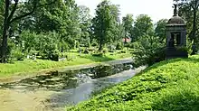 It became a prestigious burial location, and careful attention was taken in the planning and layout, which was more regular than the early cemeteries, and included a pond in the northern part. A path leads from the main entrance of the cemetery church across a bridge and aligned with the apse of the Trinity Cathedral, forming a longitudinal axis. Paths then diverge in a grid pattern to the sides, running between the Monastyrka River and the southern boundary of the monastery. New burial plots were placed in the south and in the eastern parts of the cemetery, maintaining the grid pattern.[4] Wealthy patrons commissioned large chapels and crypts, with elaborate decorations and reliefs from prominent artists such as Nikolai Laveretsky, Ivan Podozerov, Robert Bach and Ivan Schroeder.[1] Plans in 1896 to build a larger cemetery church in the Byzantine style by architect L. P. Andreyev came to nothing, as did a similar project in 1908, despite a donation of 10 thousand rubles by the ruling metropolitan.[3]