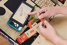 Nintendo Labo developers Kawamoto, Sakaguchi, and Ogasawara stated in an interview that their goal was to use the unique features of the Nintendo Switch in such a way that no other system could emulate. The Joy-Con were treated as a "bundle of sensors" that could be used in a multitude of ways by attaching them to different hardware pieces, focusing on the gyro motion-sensor, IR motion camera, and HD Rumble features.[9] The team was tasked with exploring Joy-Con attachment and game prototypes during three weeks of brainstorming sessions, called "prototype parties."[10][11] When asked about the choice of building material, the developers responded by saying that cardboard was chosen over plastic because the 3D printer they were using for prototyping was unable to keep up with their pace of testing; cardboard would also allow for the player to create, repair, and customize the project themselves.[12] The initial construction designs were first thought as being simple to construct, but later proved to be complex and challenging when it was decided that no cutting or gluing would be required to assemble the kits. Improvements were made to the prototypes based on feedback from consumer and developer testing; this prompted the creation of the interactive instruction software, as well as favoring simplicity over appearance. During development testing—prior to the cardboard designs being finalized—photographs were taken and compiled into booklets to be used as temporary instruction manuals; these booklets ranged from 1,000 pages for simpler models to 3,000 pages for complex ones.[13] While the cardboard Toy-Con are sturdy, Nintendo recognized that the cardboard can suffer wear and tear with time, and sells replacement sheets for individual Toy-Con through its online store.[2][14][15] When asked about the durability of Labo during an interview with CNET, Yoshiyasu Ogasawara stated, "We tested their resilience to the same action through hundreds and thousands of repetitions, so we expect them to last a long time under normal use."[16]