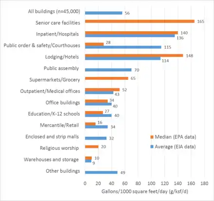Water conservation planners (at water utilities) and CII customers use several metrics of water use (and their associated benchmarks) in order to assess their success in achieving water use efficiency goals. A “metric” (or “performance indicator”) is a unit of measure (based on a formula) that can be used to calculate the rate of water use during a given period of time (and at a given level of data aggregation). A “benchmark” is a particular (numerical) value of a metric that denotes a specific level of performance, such as a water-use efficiency target.[15] When quantifying water use in the CII sector, the total volume of consumption (over any given time interval) at any given CII facility is “normalized” by the scale of water-using activity, which corresponds to the rate at which water is used (also referred to as water use intensity or WUI).[11][16] Two scaling factors (or "proxy" measures of scale), the number of employees and the square footage of buildings (or facilities) are commonly used in the CII sector because the employment and floor space data are generally available.[11] Examples of the corresponding proxy metrics are: water use per employee in manufacturing plants, or water use per square foot in office buildings. However, more appropriate are "functional" metrics such as water use per occupied room in hotels, or water use per meal served in restaurants, since they are linked more directly to water use. National surveys of commercial buildings by the U.S. DOE Energy Information Administration and EPA Energy Star provided proxy metrics data on the mean and median values of water use per square foot of buildings floor space.[13][14] The median values are useful when placing water use in a CII establishment among its peers because the sample distributions typically have a pronounced right tail skew.[14][17] Mean (or average) values are useful to planners who need to estimate total category use based on results from a sample of establishments.