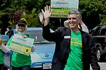 Observers expected Solomon to position himself to the left of his competitors and as the "philosophical heir" to Rep. Woolsey, a leader of the Congressional Progressive Caucus.[17][18][19] In announcing his campaign Solomon himself argued, "After so many years of progressive leadership from Lynn Woolsey, her successor in the House should have a proven commitment to a wide range of progressive values."[14] Solomon emphasized his strong environmentalist background and particularly his opposition to nuclear power, which he used to differentiate himself from his primary opponent Assemblyman Jared Huffman.[19]