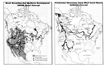 In the 1970s, the plan began to encounter fierce opposition by a number of different groups on both sides of the border, based on concerns with its financial and environmental costs and the international implications of exporting Canadian water. The environmental movement, which viewed the plan as the "hydrologic anti-Christ,"[14] gained momentum in the early 1970s, and is credited with playing a major role in halting the project.[2][15] After initially expressing support for NAWAPA as Interior Secretary in the 1960s, Stewart Udall publicly ridiculed the plan after leaving office.[1][16] The project was opposed by public sentiment in Canada,[1] though Canadian financier Simon Reisman, who negotiated the Free Trade Agreement, the precursor to the North American Free Trade Agreement, was one of its backers and main promoters. Nonetheless, the Canadian position on free trade exempted water exports, in part specifically to pre-empt any attempted completion of Reisman's long-time pet project. The NAWAPA Foundation, which Parsons had founded to promote the scheme, closed its doors in 1990.[17]