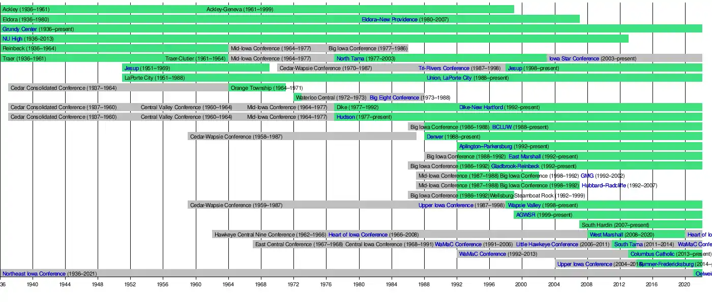 As of the late 1990s, the conference was a 17-team league. In 1998, Wapsie Valley High School and Jesup High School joined the conference. That same year, Ackley–Geneva and Wellsburg–Steamboat Rock merged districts to become AGWSR. The next membership change came in 2002 when Green Mountain–Garwin (GMG) departed for the Iowa Star Conference. The next year, North Tama left for the Iowa Star Conference. In 2007, Eldora–New Providence and Hubbard–Radcliffe joined districts to become South Hardin High School. For the 2008 year, West Marshall was added to the conference, making it a 15-team league. In 2011, South Tama joined after leaving the Little Hawkeye Conference and started in the West Division. It became the 16th member of the conference. Northern University High School (Cedar Falls) played its final season in 2011–12, due to the University of Northern Iowa closing Malcolm Price Lab, which houses Northern University High.[1] Waterloo Columbus joined in 2013 to replace the recently defunct NU High. With the departure of South Tama, Sumner-Fredericksburg joined in 2014 which brought the total number of schools to 16 once again. In 2020, West Marshall will leave the conference for the Little Hawkeye Conference. Oelwein will join soon after to replace West Marshall and a new three-division structure will ensue.