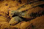 The leatherback sea turtle (Dermochelys coriacea) is the largest of all living sea turtles and the fourth largest modern reptile behind three crocodilians.[38] It can easily be differentiated from other modern sea turtles by its lack of a bony shell. Instead, its carapace is covered by skin and oily flesh. Dermochelys coriacea is the only extant species of the family Dermochelyidae.