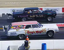Nostalgia Super Stock is an index-style foot brake only class for the year models, body styles, and engine combinations which raced in the A/FX and Super Stock classes of the ’60s. Exceptions in the authenticity of these cars will be allowed, for instance those relating to safety, equality in performance, availability, and durability. Sandbagging, excessive braking near the finish line or excessive mph for a given e.t. is subject to result in a disqualification. The class will qualify by elapsed time closest to index, be paired according to qualifying positions, and then advance to eliminations.[3]