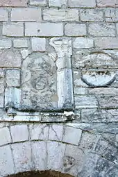 Above the door can be seen a very damaged escutcheon of François I, the arms of France, three fleurs-de-lys with a salamander below. Nearby, to the right, is a rounded stone weathered by time which once represented the lamb of John the Apostle with its banner.[13]