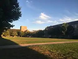 The main center of the College is O'Shaughnessy Hall, which hosts classrooms, art galleries, a coffee shop, and administrative offices. It was built in 1953 by Ellerbe Associates in Tudor Gothic style. Ground was broken for in July 1951 and the cornerstone was laid in May, The wings of the building meet at a central six-story tower. In addition to classrooms, the building also featured music rooms and 4 art galleries, which were later incorporated into the Snite Museum of Art. The high-beam decorated ceiling was painted by Alphonse Schmitt. The building was the gift of philanthropist Ignatius Aloysius O'Shaughnessy and cost $2,300,000.[3] Its Great Hall, which is decorated and sculpted on the outside, features a crucifix by Croatian sculptor Ivan Meštrović, a bust of Dean Charles E. Sheedy, and 7 stained glass windows, representing the seven liberal arts.[4] The Great Hall also hosts two tapestries that were rediscovered and restored in 2014 when the Hall was restored to its original appearance. One tapestry is of German or Belgian production from the 17th century, while the other one is from 18th century France.[5] It was featured in the movie Rudy.[6]