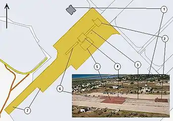 The carrier take-off trainer faces northeast on the northern parallel runway. The carrier landing trainer is on the southwest end of that runway.
