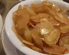 The pericarp (fruit covering) is used to make jam, or is finely sliced, cooked with sugar, and crystallised to make a fragrant candy. Sliced nutmeg fruit flesh is made as manisan (sweets), either wet, which is seasoned in sugary syrup liquid, or dry coated with sugar, a dessert called manisan pala in Indonesia. In Penang cuisine, dried, shredded nutmeg rind with sugar coating is used as toppings on the uniquely Penang ais kacang. Nutmeg rind is also blended (creating a fresh, green, tangy taste and white colour juice) or boiled (resulting in a much sweeter and brown juice) to make iced nutmeg juice. In Kerala Malabar region of India, it is used for juice, pickles and chutney.[12]