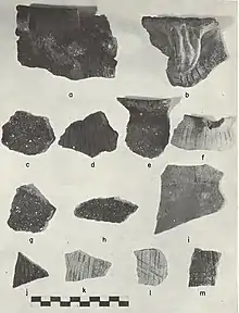 The 1958 excavations recovered 1,270 sherds, almost all of it Huber ware. Surface was plain on 98% of sherds and cordmarked on 2%. Half of the lips were unnotched. The most common rim profile reported was everted with flat lip and either wide-notched or unnotched lip. Rarely, sherds were red-slipped on the exterior and/or interior.[2]