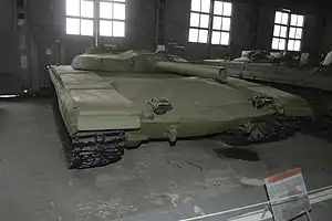 The tank had an extremely low profile, with a crew of two which sat in an isolated compartment in the turret. The main armament was a 125 mm rifled missile launcher, with a maximum range of 4 km for the "Rubin" anti-tank guided missiles, and 9 km for the "Bur" surface-to-surface missiles. It had a rate of fire of 4-5 rounds/min for the "Rubin", and 8-10 rounds/min for the "Bur". Both munitions were guided by an infra-red beam. The "Rubin" anti-tank missiles were capable of penetrating 250 mm of armor at 60° at a range of 4 km.