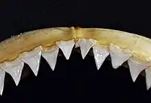 Most of its fins (dorsal, pectoral, pelvic and caudal) have white tips (juvenile specimens and some adults may lack these). Along with white tips, the fins may be mottled, and young specimens can have black marks. A saddle-like marking may be apparent between first and second dorsal fins.[6] The shark has several kinds of teeth. Those in the mandible (lower jaw) have a thin, serrated tip and are relatively small and triangular (somewhat fang-like). Between 13 and 15 teeth are on either side of the symphysis. The teeth in the upper jaw are triangular, but much larger and broader with entirely serrated edges—14 or 15 occur along each side of the symphysis.[6] The denticles lie flat and typically have between five and seven ridges.[6]