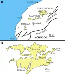 Ocepeia is from the Paleocene of Morocco's Ouled Abdoun Basin, although its fossils were initially thought to be earliest Ypresian (early Eocene) in age.[1] That age has been revised, and now it is known that O. daouiensis comes from the same bone bed that is dated to the Selandian age of the Paleocene (59-60 MYA), which also yields Eritherium, Abdounodus, and Lahimia.[3] O. grandis is slightly younger (more recent) in age, occurring in the Thanetian bone bed of the same area.[3][16] Its larger size and younger age suggest it is in the same evolutionary lineage as O. daouiensis.[3][lower-alpha 5] The area of western Morocco during the late Cretaceous through the Eocene consisted of warm, shallow inland seas, where the ancient Tethys Ocean met the Atlantic Ocean, and during which phosphate deposits and associated fossils accumulated over some 25 million years.[17]