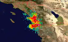 The October 2007 California wildfires, also known as the Fall 2007 California firestorm,[11] were a series of about thirty wildfires (17 of which became major wildfires)[4] that began igniting across Southern California on October 20. At least 1,500 homes were destroyed[12] and approximately 972,147 acres (about 3,934 km2, or 1,520 mi2) of land was burned from Santa Barbara County to the U.S.–Mexico border, surpassing the October 2003 California wildfires in scope, which were estimated to have burned 800,000 acres (3,200 km2).[1] The wildfires killed a total of 14 people, with nine of them dying directly from the fires;[13] 160 others were injured, including at least 124 firefighters.[1][14] At their height, the raging fires were visible from space.[15] These fires included the vast majority of the largest and deadliest wildfires of the 2007 California wildfire season. The only wildfire in 2007 that surpassed any of the individual October 2007 fires in size was the Zaca Fire.[16]