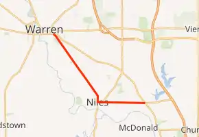 SR 169 was created in 1923 as a northeast bypass of Niles, with SR 16 going through Niles.[4] In 1927, SR 169 was moved to SR 16's routing through Niles, and the Niles bypass became part of the newly-designated US 422.[5][6] Until August 2007, SR 169 ran west with US 422 in Warren to the SR 45 intersection.[7][8]
