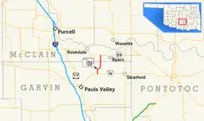 SH-133's southern terminus is at SH-19 seven miles (11 km) northeast of Pauls Valley.[4] The highway begins in Garvin County and crosses into McClain County 2.55 miles (4.10 km) north of SH-19.[1] The highway ends two miles (3.2 km) north of the county line at SH-59 between Rosedale and Byars.[2]