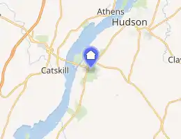 Olana is in the south part of Greenport, New York, in Columbia County, south of Hudson and east of Catskill. By car, the estate can be reached from New York State Route 9G, less than an hour's drive south of Albany. The nearest Amtrak train station is in Hudson. The grounds are open during the day throughout the year and the original carriage roads are accessible. Organized tours of the residence are generally available Tuesday through Sunday, and holiday Mondays, from April to October. From November to March, tours are conducted Friday through Sunday. Reservations for house tours are recommended.[35] Photography is permitted anywhere on the grounds, including the interior of the house. The Hudson River Skywalk, a pedestrian walkway across the Rip Van Winkle Bridge opened in 2019, connects the site to the Thomas Cole National Historic Site in Catskill.[36][37]