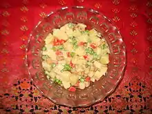 Olivier salad (Persian: الويه) is popular in Iran, where it is usually made with potatoes, eggs, Persian pickled cucumbers, carrots, chicken, peas and mayonnaise, and is frequently had as a sandwich filler.[9]
