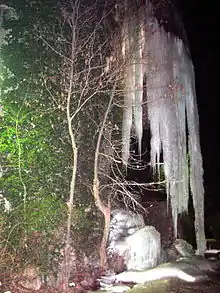 The Valganna branch also gives rise to the Fonteviva lake, dedicated to sport fishing,[16] and to the Valganna waterfalls, which in winter, due to the harsh climate, are often frozen. They are found in the municipality of Induno Olona and are close to the famous and homonymous caves.[17] On the waterfalls, which were artificially created at the beginning of the 20th century to improve water withdrawal, one can admire the phenomenon of travertine surfacing.[18]