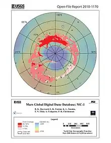 Olympia Undae is a vast dune field in the north polar region of the planet Mars. It consists of a broad "sand sea" or erg that partly rings the north polar plateau (Planum Boreum) from about 120° to 240°E longitude and 78° to 83°N latitude. Stretching about 1,100 km (680 mi) across[1] and covering an area of 470,000 km2,[2] Olympia Undae is the largest continuous dune field on Mars. It is similar in size to the Rub' Al Khali in the Arabian Peninsula, the largest active erg on Earth.[3]