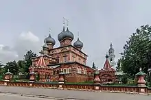 Some scholars postulate that the Russians borrowed onion domes from Muslim countries, possibly from the Khanate of Kazan, whose conquest in 1552 Ivan the Terrible commemorated by erecting St. Basil's Cathedral.[3] Eight of the nine domes featured on St. Basil's Cathedral represent each attack on Kazan. The ninth dome was constructed 36 years after the siege of Kazan as a tomb for Ivan. The ornate finishes of these domes are bright in color and bold in shape as they are adorned with pyramids and stripes, and many other patterns seen on other cathedrals than Basil's.[4] Some scholars believe that onion domes first appeared in Russian wooden architecture above tent-like churches. According to this theory, onion domes were strictly utilitarian, as they prevented snow from piling on the roof.[5]