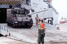 ![]() An M577 command and control vehicle rolls off the Military Sealift Command ship MV Cape Decision | |||||||