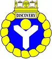 a shakefork—Azure, a shakefork argent supporting in the middle chief a bezant, within an annulet enwreathed, ensigned of a naval crown or, the sails argent, beneath which on a panel argent edged or is the name ‘Discovery’ in letters sable—HM Canadian Ship Discovery