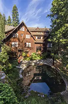 The architecture of the Chateau building, as well as several other buildings nearby of the same age, is rustic. The building exterior is sheathed with cedar bark, giving it a shaggy appearance. Both shed and dormer style roofs mimic the surrounding mountains. Extensive rock work was constructed by the Civilian Conservation Corps under the direction of the Plans and Design branch of the Park Service, headed by Thomas Chalmers Vint, creating a bond between the building and the landscape.[5] A small pond with a waterfall is in the courtyard.