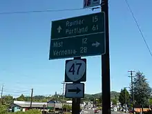 Oregon Route 47 is an Oregon state highway that runs between the Willamette Valley, near McMinnville, and the city of Clatskanie, along the Columbia River in the northwest part of the state. OR 47 traverses several highways of the Oregon state highway system: part of the Tualatin Valley Highway No. 29, part of the Nehalem Highway No. 102, part of the Sunset Highway No. 47, and the Mist–Clatskanie Highway No. 110.[2]
