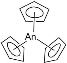 These compounds have been known since the sixties, however until 2018 only the neptunium compound was structurally characterised. Kovàcs and coworkers were able to analyse the plutonium and uranium complexes, finding that all three structures were similar, with an asymmetrical distribution of cylopentadienide ligands and a higher covalent character to the carbon-actinide bond than in organolanthanide compounds.[16]