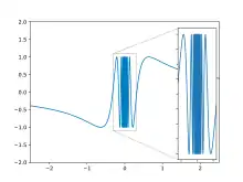 In mathematics, the oscillation of a function or a sequence is a number that quantifies how much that sequence or function varies between its extreme values as it approaches infinity or a point. As is the case with limits, there are several definitions that put the intuitive concept into a form suitable for a mathematical treatment: oscillation of a sequence of real numbers, oscillation of a real-valued function at a point, and oscillation of a function on an interval (or open set).