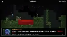 Out There Somewhere plays as a standard platformer, with the twist being that the player character, Yuri, is armed with a portal gun, which, when fired, shoots out a blue plasma-like bullet that teleports Yuri to wherever it hits. Later, he also obtains a gun which allows him to kill enemies and break blocks, and it is also possible to collect upgrades to Yuri's health and his spaceship.