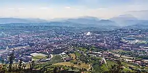 Oviedo (UK: /ˌɒviˈeɪdoʊ/, US: /ˌoʊvi-, oʊˈvjeɪdoʊ, -ˈvjɛ-, -ðoʊ/,[2][3][4] Spanish: [oˈβjeðo]; Asturian: Uviéu [uˈβjeʊ]) is the capital city of the Principality of Asturias in northern Spain and the administrative and commercial centre of the region. It is also the name of the municipality that contains the city. Oviedo is located approximately 24 km (15 mi) southwest of Gijón[5] and 23 km (14 mi) south of Avilés,[6] both of which lie on the shoreline of the Bay of Biscay. Oviedo's proximity to the ocean of less than 30 kilometres (19 mi) in combination with its elevated position with areas of the city more than 300 metres above sea level causes the city to have a maritime climate, in spite of it not being located on the shoreline itself.