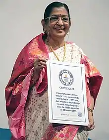 Pulapaka Susheela (born 13 November 1935), popularly known as P. Susheela, is an Indian playback singer associated with the South Indian cinema primarily from Andhra Pradesh for over six decades. She has been recognized by the Guinness Book of World Records as well as by the Asia Book of Records for performing a record number of songs in different Indian languages.[1] She is also the recipient of five National Film Award for Best Female Playback Singer and numerous state awards.[2][3] Susheela is widely acclaimed as a singer who defined feminism[4] in South Indian cinema and is well known for her mellifluous[5][6] vocal performances[7] for over 50,000 film songs[8] across South Indian languages.