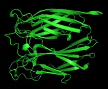 PNGase F requires a minimum of two GlcNAc oligosaccharide residues attached to the asparagine in order for catalysis to occur.[11] This enzyme utilizes a catalytic triad of cysteine-histidine-aspartate in its active site, which is a common motif for amidases. This motif contains a nucleophile, a proton donor, and a positive charge to stabilize the tetrahedral intermediate. The crystal structure of PNGase F from flavobacterium miningosepticum, with 1.8 Å resolution, was found to be folded in two domains, each with an eight-stranded antiparallel β barrel, or jelly roll, configuration. This structure is similar to lectins and glucanases, suggesting similarities with lectins and other carbohydrate-binding proteins.[3]