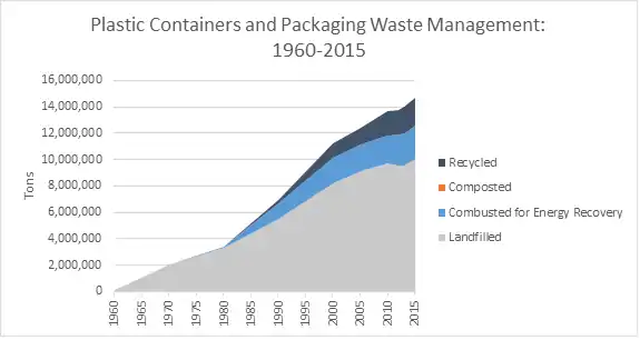 Plastic containers and packaging can be found in plastic bottles, supermarket bags, milk and water jugs, and more. EPA used data from the American Chemistry Council to estimate that 14.7 million tons (5.5 percent of MSW generation) of plastic containers and packaging were created in 2015.[1] The overall amount that is recycled is about 2.2 million tons (14.6 percent).[1] In addition, 16.8 percent were combusted with energy recover and 68.6 percent went straight into the land fill.[1] Most of the plastics are made from polyethylene terephthalate (PET), high-density polyethylene (HDPE), low-density polyethylene (LDPE), polyvinyl chloride (PVC), polystyrene (PS), polypropylene (PP) and other resins.[1] That being said, the recycling rate for PET bottles and jars was 29.9 percent (890,000 tons) and the recycling of HDPE water and milk jugs was 30.3 percent (230,000 tons).[1]