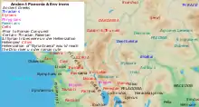 The exact original boundaries of Paeonia, like the early history of its inhabitants, are obscure, but it is known that it roughly corresponds to most of present-day North Macedonia and north-central parts of Greek Macedonia (i.e. probably the Greek municipalities of Paionia, Almopia, Sintiki, Irakleia, and Serres), and a small part of south-western Bulgaria.[1][2][3][4] Ancient authors placed it south of Dardania (an area corresponding to modern-day Kosovo and northern North Macedonia), west of the Thracian mountains, and east of the southernmost Illyrians.[5] It was separated from Dardania by the mountains through which the Vardar river passes from the field of Scupi (modern Skopje) to the valley of Bylazora (near modern Sveti Nikole).