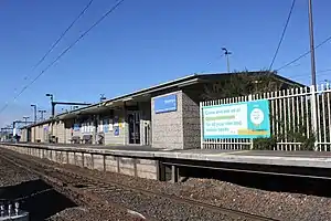 The current island platform was provided in 1959.[3] In 1970, the station buildings were replaced with a new pebblestone structure, and in 1975, electrified suburban services were extended to the station. Further upgrades to the station occurred in 1979/1980.[4] Boom barriers were provided at the Main Street level crossing in 1986.[5] It was upgraded to a premium station on 15 March 1997.[6] Since 2001, it has been the extremity of the electrified network.