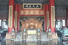 Above the throne hangs a tablet with a right-to-left script reading zhèng dà guāng míng (正大光明), penned by the Shunzhi Emperor. This tablet has been translated several ways but the loose transliteral meaning is "let the righteous shine". It is often used as a Chinese idiom, meaning "to be decent, honest and magnanimous," or "to have no secret or do a shameless deed." Beginning with the Yongzheng Emperor, who himself had ascended the throne amid a succession dispute, Qing dynasty emperors had designated their heirs in secret, with one copy of the will hidden behind this tablet and another carried at all times by the Emperor himself.[3]