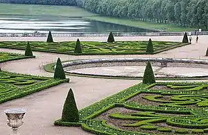The first phase of the expansion (c. 1661–1678) was designed and supervised by the architect Louis Le Vau. Initially he added two wings to the forecourt, one for servants quarters and kitchens, the other for stables.[10] In 1668 he added three new wings built of stone, known as the envelope, to the north, south and west (the garden side) of the original château. These buildings had nearly-flat roofs covered with lead. The king also commissioned the landscape designer André Le Nôtre to create the most magnificent gardens in Europe, embellished with fountains, statues, basins, canals, geometric flower beds and groves of trees. He also added two grottos in the Italian style and an immense orangerie to house fruit trees, as well as a zoo with a central pavilion for exotic animals.[6] After Le Vau's death in 1670, the work was taken over and completed by his assistant François d'Orbay.[11]