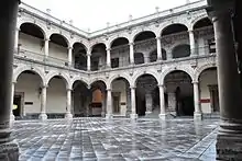 From nearly the beginning of the colonial period until the Mexican War of Independence, this spot has been the headquarters of the Inquisition in the colony of New Spain.[2][3] While the Tribunal of the Holy Inquisition was not fully established here until 1571, the first cleric with inquisitorial duties was Martin de Valencia, who came to the colony in 1524. The Dominicans, in whom the papacy had invested Inquisition duties, arrived in 1526 and proceeded to build a monastery in the area occupied by both the current Palace and the Church of Santo Domingo. The first official Inquisitor for the colony, Pedro Moya de Contreras, worked in the section of the monastery where the later, 18th century Palace would be built.[2]