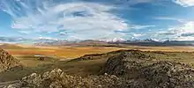 In the South Siberian Mountains, it inhabits grasslands on the Ukok Plateau and in the Altai, Kuray and Saylyugem Mountains.[31] It is also present in Chagan-Uzun and Argut river basins, Mongun-Taiga, Uvs Lake Basin, Sayano-Shushenski Nature Reserve, Tunkinsky National Park, Lake Gusinoye basin and in the interfluves of the Selenga, Chikoy and Khilok rivers.[32] In the eastern Sayan Mountains, its presence was documented for the first time in 1997.[33] In Transbaikal, it inhabits montane steppes at elevations of 600–800 m (2,000–2,600 ft), where annual rainfall ranges from 150 to 400 mm (5.9 to 15.7 in).[34] In 2013, an individual was observed on the Vitim Plateau.[35]