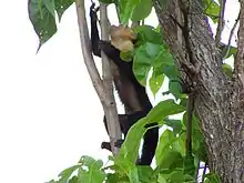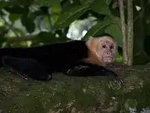 Like other monkeys in the genus Cebus, the Panamanian white-faced capuchin is named after the order of Capuchin friars – the cowls of these friars closely resemble the monkey's head coloration.[6][7] The Panamanian white-faced capuchin has mostly black fur, with white to yellow like fur on the neck, throat, chest, shoulders, and upper arms.[8] The face is pink or a white-cream color and may have identifying marks such as dark brows or dark fur patches.[8][9][10] An area of black fur on the crown of the head is distinctive.[8][11] It has a prehensile tail that is often held coiled, giving the white-faced capuchins the nickname "ringtail".[8][12]