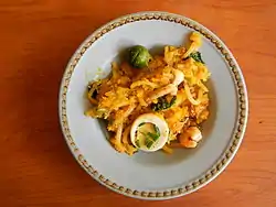 Pancit Malabon is a Filipino dish that is a type of pancit, or stir-fried noodle dish, which originated in Malabon City, Metro Manila, Philippines. Its sauce has a yellow-orange hue, attributable to achuete (annatto seeds), shrimp broth, and flavor seasoned with patis (fish sauce for a complex umami flavor) and crab fat. Local fresh seafood toppings may include cooked shrimp, squid, smoked bangus (milkfish), mussels, and/or oysters. Other optional garnishes can include pork, hard-boiled duck/hen eggs, crushed chicharron (pork rinds), chopped green onions, lightly browned sautéed minced garlic, and spritz of calamansi (or tropical lemon/lime wedges) juice.