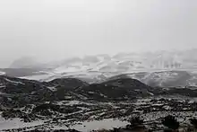 Periglacial landscapes are frequent in the area; they include rounded landforms, smooth surfaces, solifluction terrain and striated terrain.[78] This extensiveness is the result of the relatively dry climate in the region, which limits the development of glaciers.[79] On Parinacota, landforms of this type are found starting from 4,450 metres (14,600 ft) elevation and become dominant above 5,300 metres (17,400 ft) until the glacier line.[37] The extent of their development is a function of the age of the underlying rocks as well; Holocene volcanic rocks have little periglacial alteration while older rock formations at times are heavily altered.[36] Lahars also occurred during the history of Parinacota; 0.2–2 metres (7.9 in–6 ft 6.7 in) thick layers of lahar deposits are found on the southern and eastern slopes[23] and form a fan on the northwestern slope of Parinacota. At this fan, lahar deposits reach distances of 15 kilometres (9.3 mi) away from the volcano.[22]