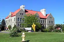 White's Romanesque Revival three-story structure featured a small central circular building, two rectangular wings, and an eight-story, four-faced clock tower.[10] Construction on the building, located at 1400 First Avenue North, began in 1894. The high school was built of gray sandstone obtained from quarries near both Helena and Great Falls.[10][11] The walls, which were 5 feet (1.5 m) thick at the bottom of the building but only 4 feet (1.2 m) thick at the roof, were sunk 16 feet (4.9 m) into the earth and stood on shale bedrock.[10] To compact the foundation's backfill, a herd of sheep was driven around the structure 100 times.[10][11] Wood for the interior supports, roof, and steps were cut from massive trees logged in the Rocky Mountains and floated down the Missouri River.[10][11]